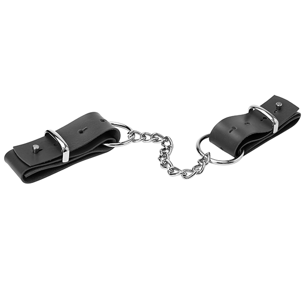 Detalhamento:   Algema Fina Sexy Black é confeccionado em tiras de couro ecológico com ilhós, argolas  e corrente na cor prata. Os punhos são facilmente ajustados por meio de clip duplo com encaixe.