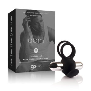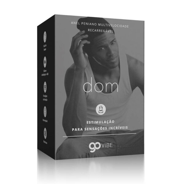 Embalagem: Caixa de papel contendo 01 unidade da Anel Vibratório Recarregável Go Vibe Dom e 01 unidade do carregador de cabo USB.