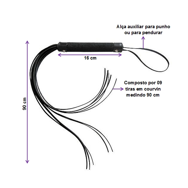 - Chicote com 09 tiras macias medindo 90cm.