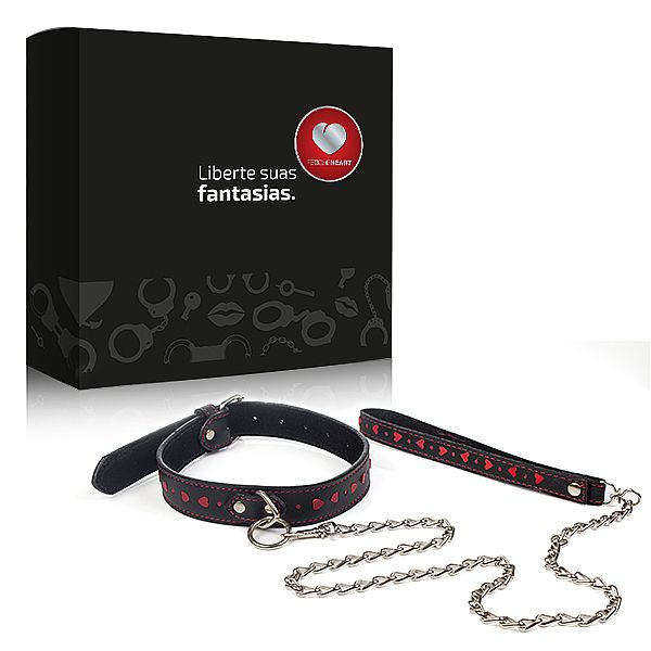 Cor: Guia e coleira na cor preta com detalhe vermelho no coração. Corrente e fivela na cor prata.