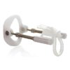- Ajuste o tubo D puxando-o para baixo, prendendo a base da glande delicadamente ( sem estrangulamento). Após ajustar, encaixe o tubo na parte de baixo da peça C, em suas respectivas ranhuras para manter o pênis preso, proporcionando a tensão.