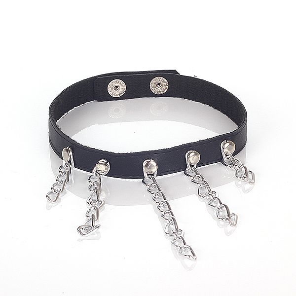 - Gargantilha em couro sintético com acabamento em corrente de metal.