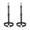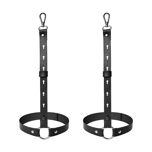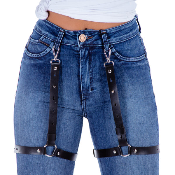 Composição: Um par de liga (02 unidades) confeccionada em couro ecológico na cor preta e argolas, ilhós e mosquetão de metal na cor prata.