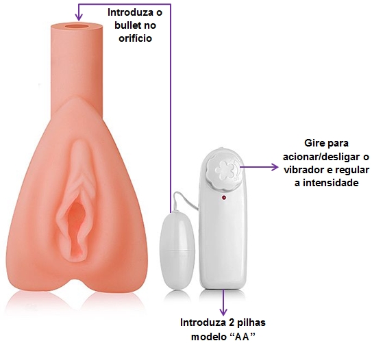 Composição: PussyVibe confeccionado em Mega Skin atóxico. Bullet com vibrador em PVC atóxico.