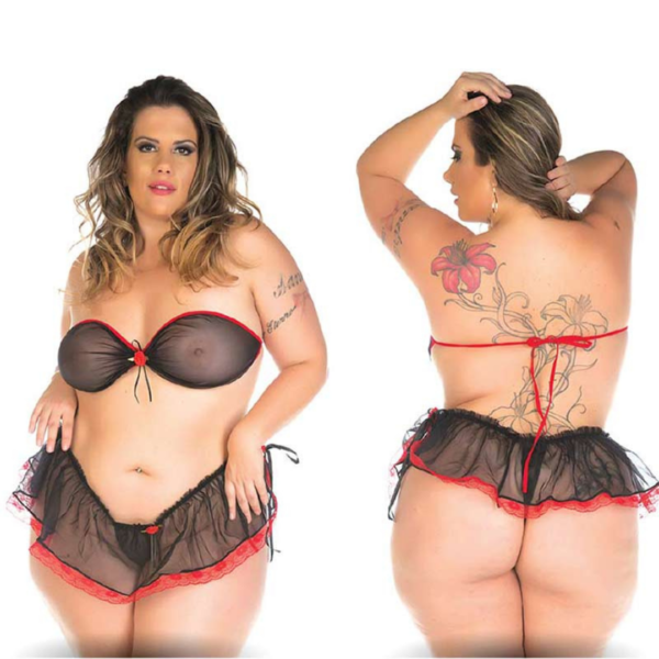 Tecido: Mini fantasia Plus Size feita em tule, com detalhes de renda e cetim, em poliamida, contém elastano e 100% poliéster.