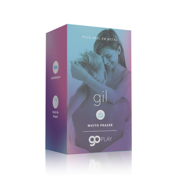 Embalagem: Caixa de papel contendo 01 Plug anal metal Go Play Gil acondicionado em saquinho com cadarço.