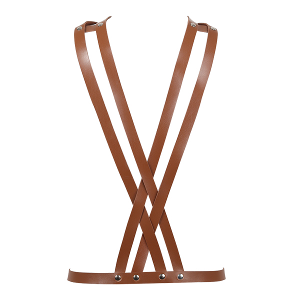 Composição: Peça confeccionada em couro ecológico na cor camelo. Os ajustes da cintura e costas é feito meio de tiras de elastano com colchete. Ilhós e botões em metal na cor prata finalizam a peça com requinte e bom gosto.