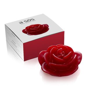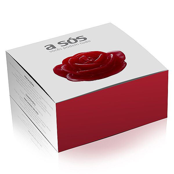 Embalagem: Caixa de papel presenteável contendo 01 vela em formato de rosa na cor vermelha.