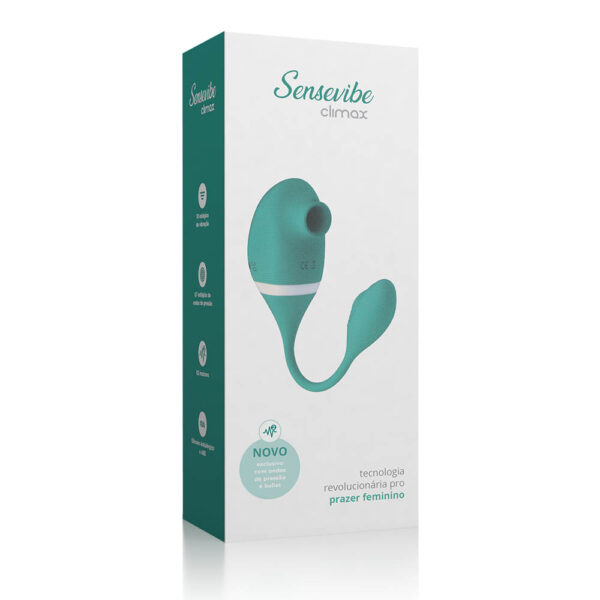 Embalagem: Caixa de papel contendo 01 vibrador e estimulador de clitóris recarregável Sensevibe Climax, 01 cabo de carregamento USB e 01 manual de utilização.