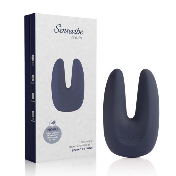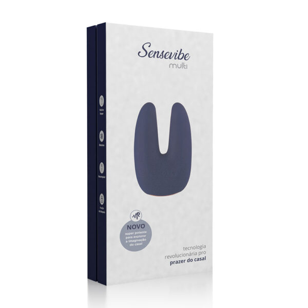 Embalagem: Caixa de papel contendo 01 Vibrador e Estimulador Multivelocidade Recarregável SensevibeMulti, 01 cabo de carregamento USB, 01 controle remoto sem fio e manual de instruções.