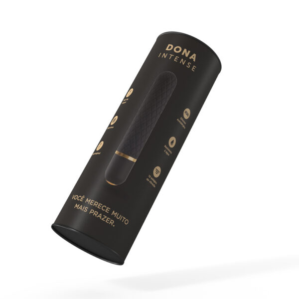 Embalagem: Caixa de papel contendo 01 unidade do vibrador e estimulador multivelocidade recarregável Dona Intense, 01 cabo de carregamento USB e 01 manual de utilização.