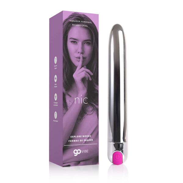 Embalagem: Caixa de papel contendo 01 unidade do vibrador multivelocidade personal recarregável Go Vibe Nic