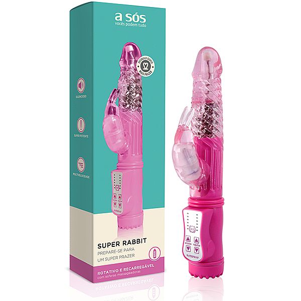Embalagem: Caixa de papel contendo 01 unidade do Vibrador Rotativo Super Rabbit Recarregável rosa – Acompanha cabo USB.