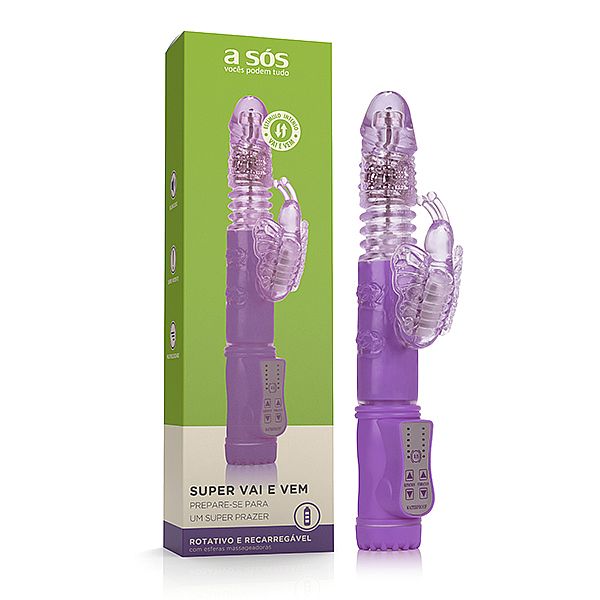 Embalagem: Caixa de papel contendo 01 unidade do Vibrador Rotativo Super Vai e Vem Recarregável Lilás – Acompanha 01 cabo USB.